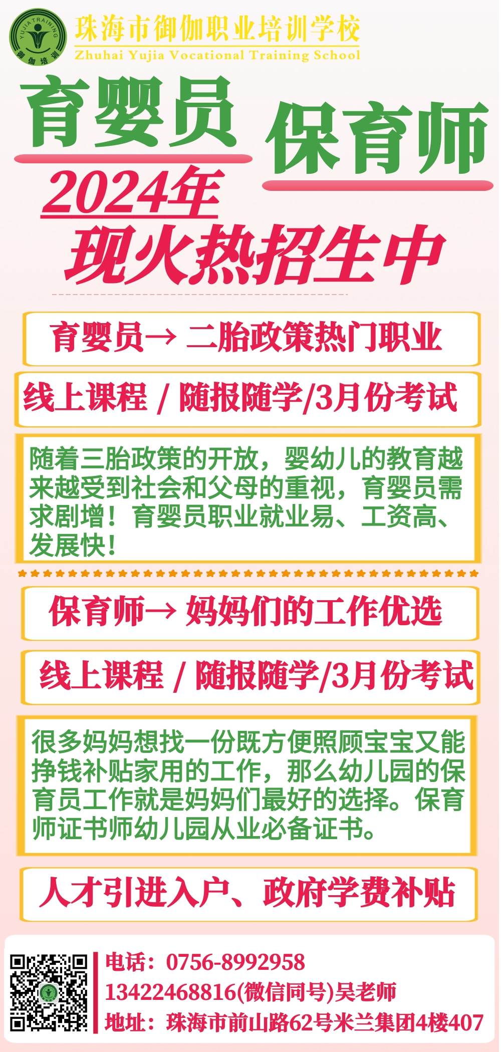 地址:珠海市香洲区前山路62号,米兰集团4楼407 电话:0756-8992958 公众微信号:yj8992958 QQ:3143017654 邮箱:3143017654@qq.com 学校网址:www.zhyjpx.com